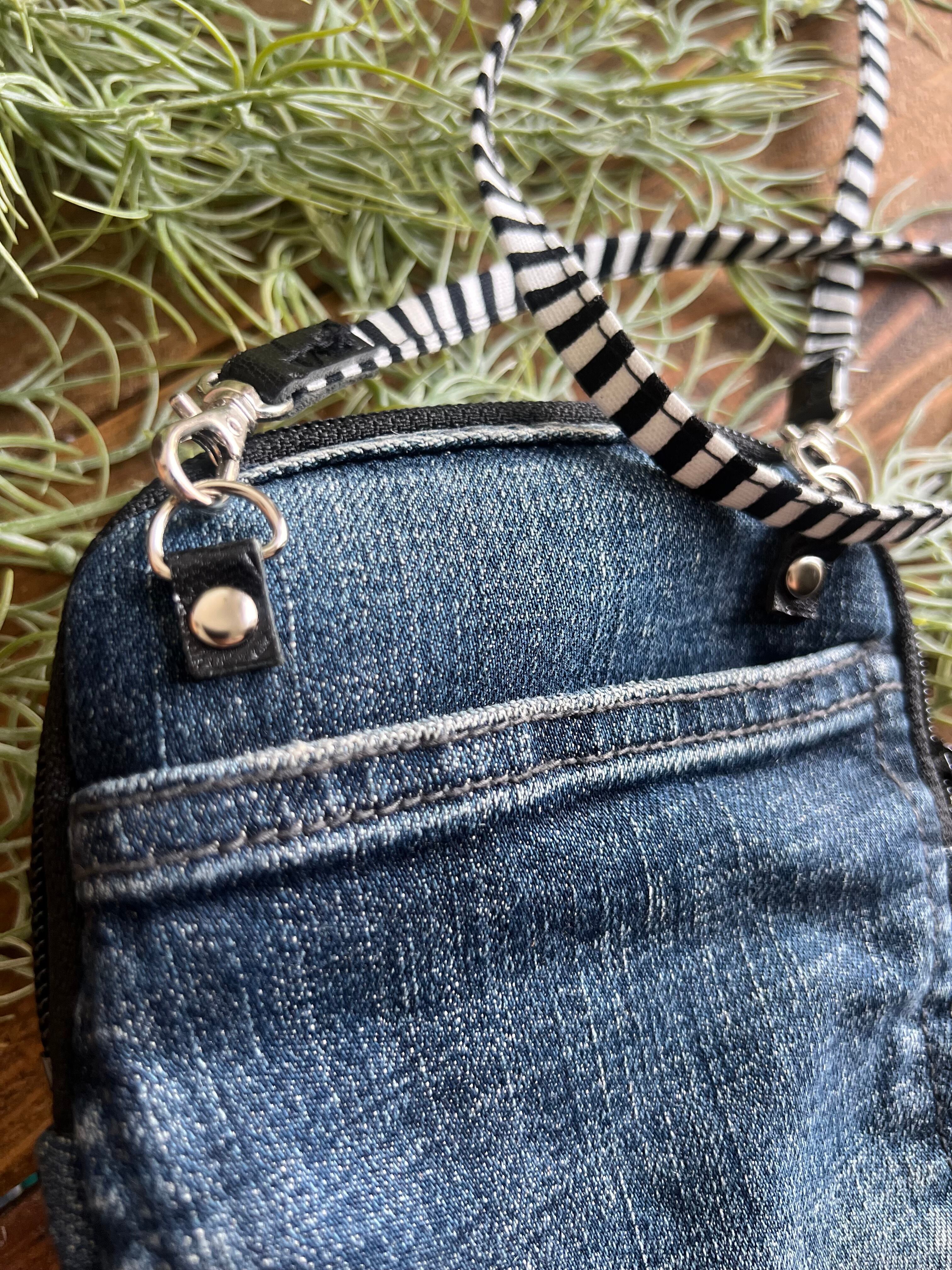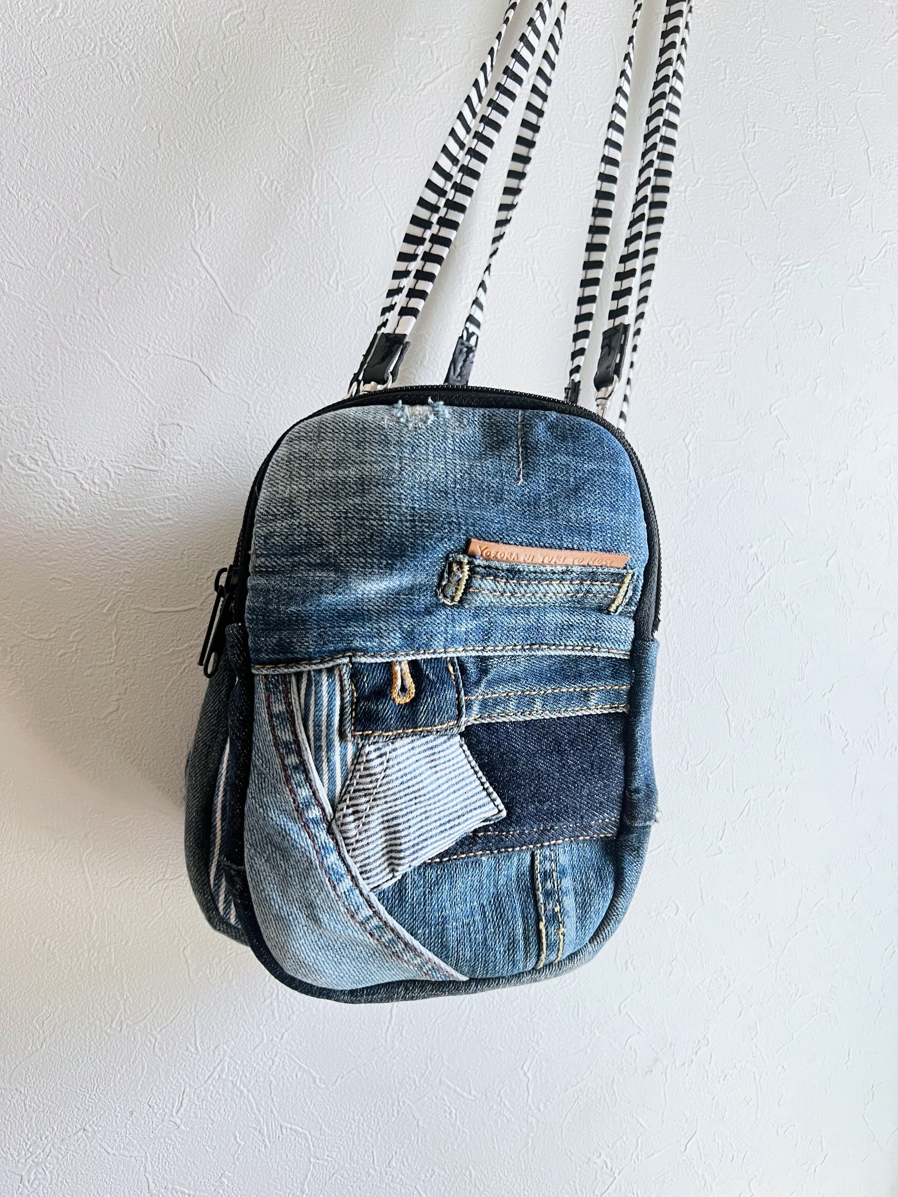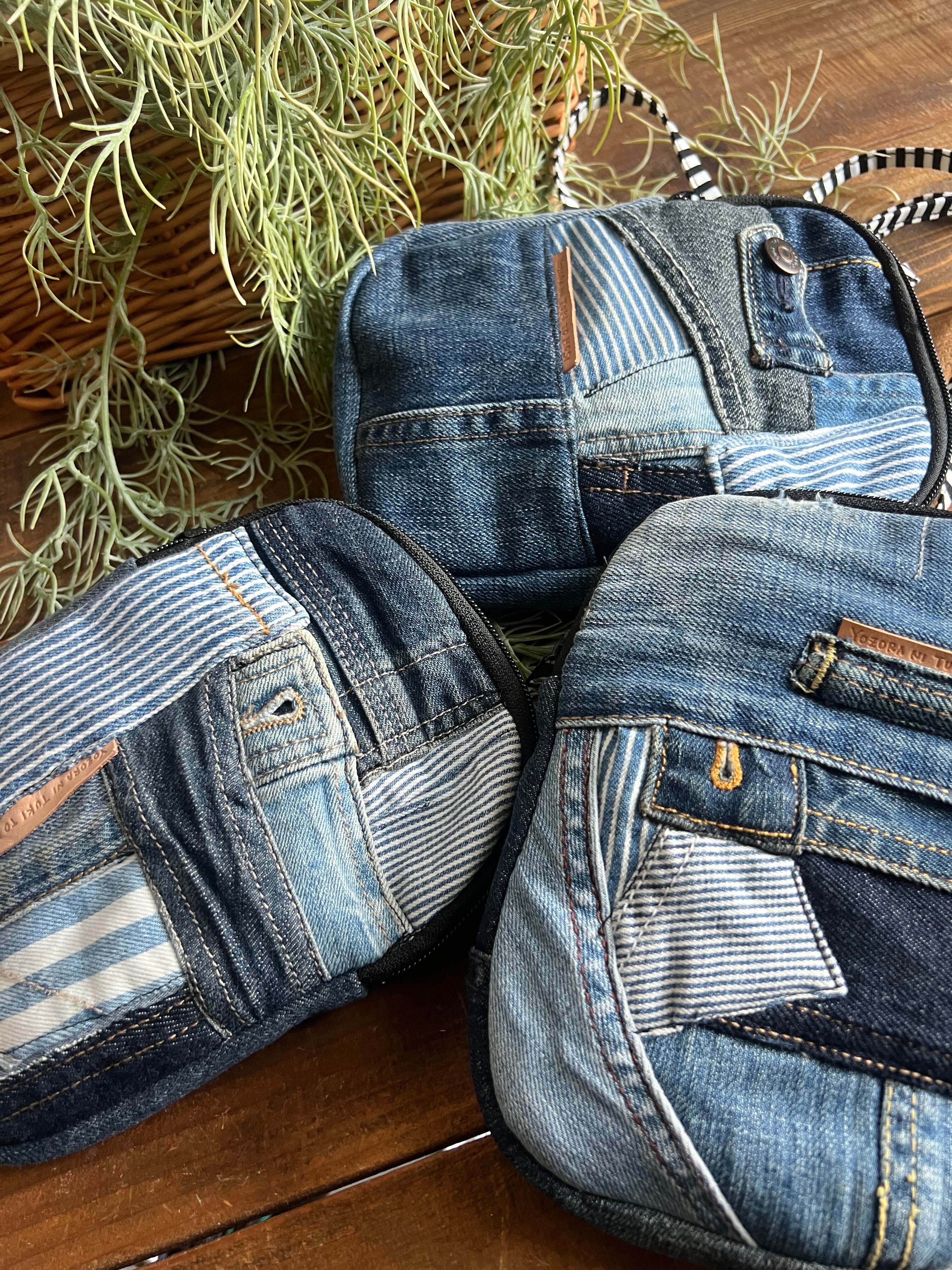 デニムリメイク / デニム / プレゼント / ファッション / オリジナル // デニムバッグ / リメイクカバン / おしゃれ / カジュアル / 贈り物 // ママデビュー / 青いかばん / ストライプ柄 / ポケット / 収納 / ファスナー/お出かけ /スマホケース/スマートフォンポシェット/ポーチ/ポーチポシェット