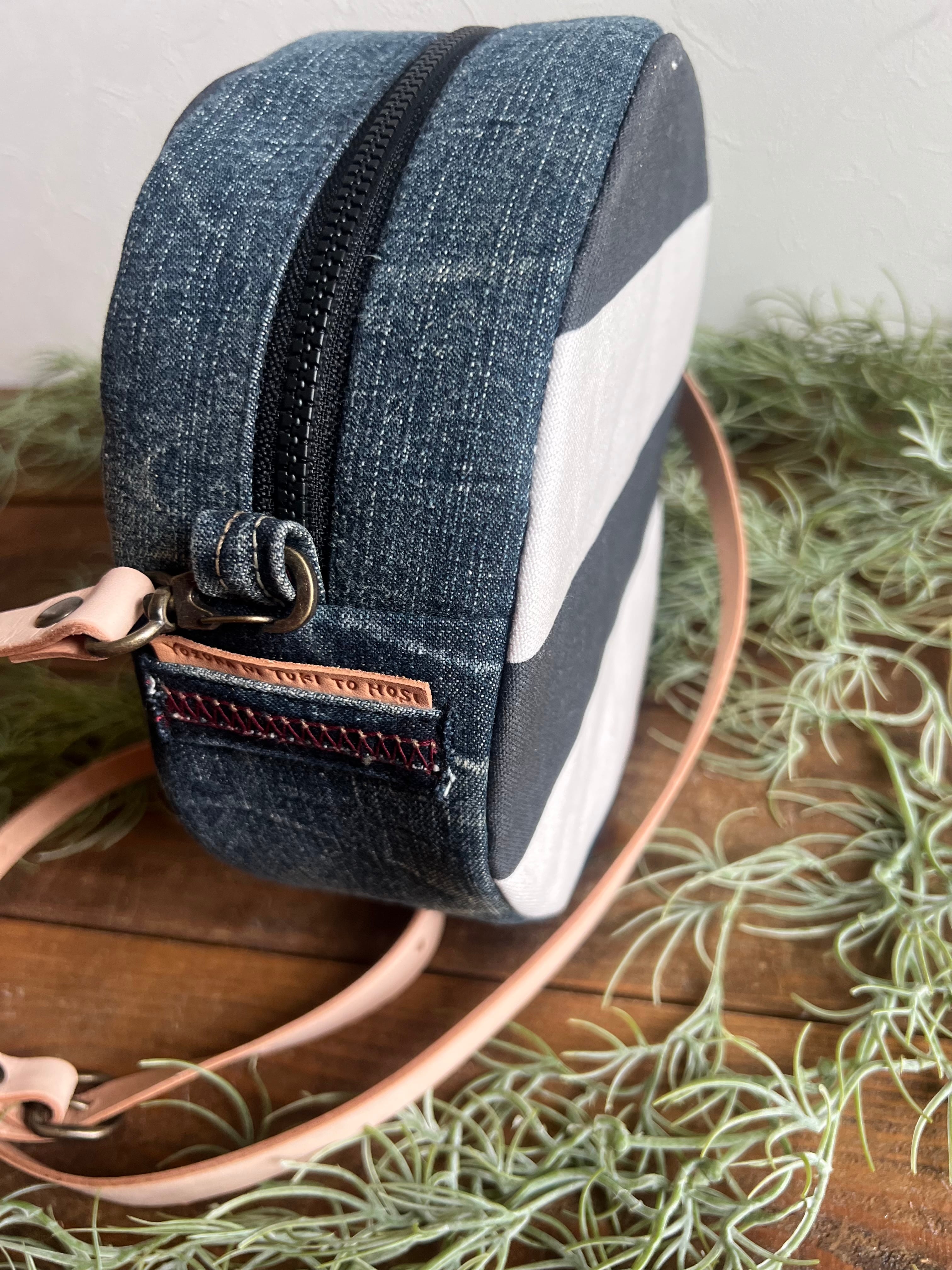 デニムリメイク / デニム / プレゼント / ファッション / オリジナル /ストライプ/ デニムバッグ / リメイクカバン / おしゃれ / カジュアル / 贈り物 /丸/ ママデビュー / 青いかばん / ストライプ柄 / ポケット / 収納 / ファスナー/お出かけ /ポシェット/ポーチポシェット